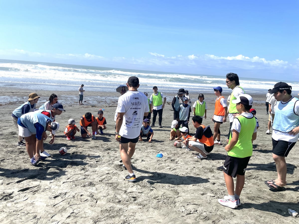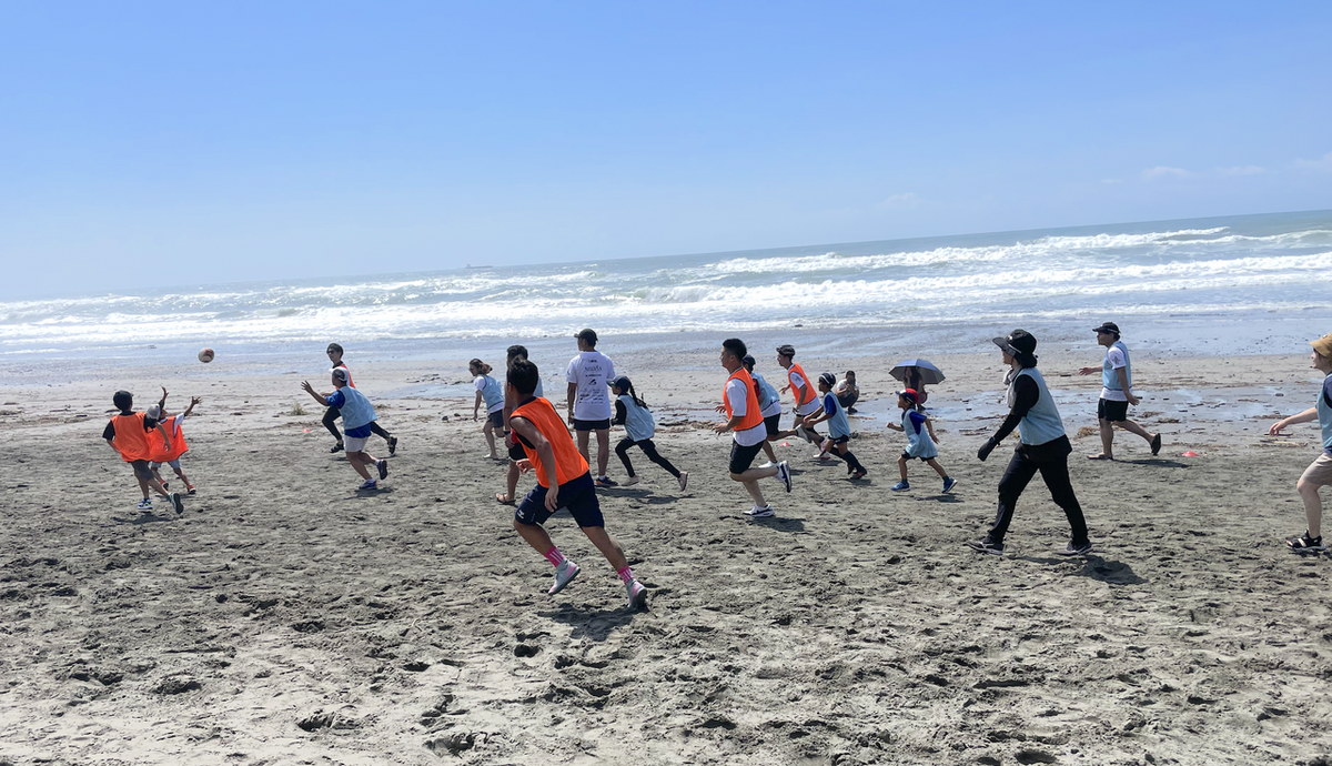 御前崎市で行われたサーフイベント[MIDAS CAPITAL OMAEZAKI Pro2025]内の砂浜を使いラグビー体験イベントを行いました。